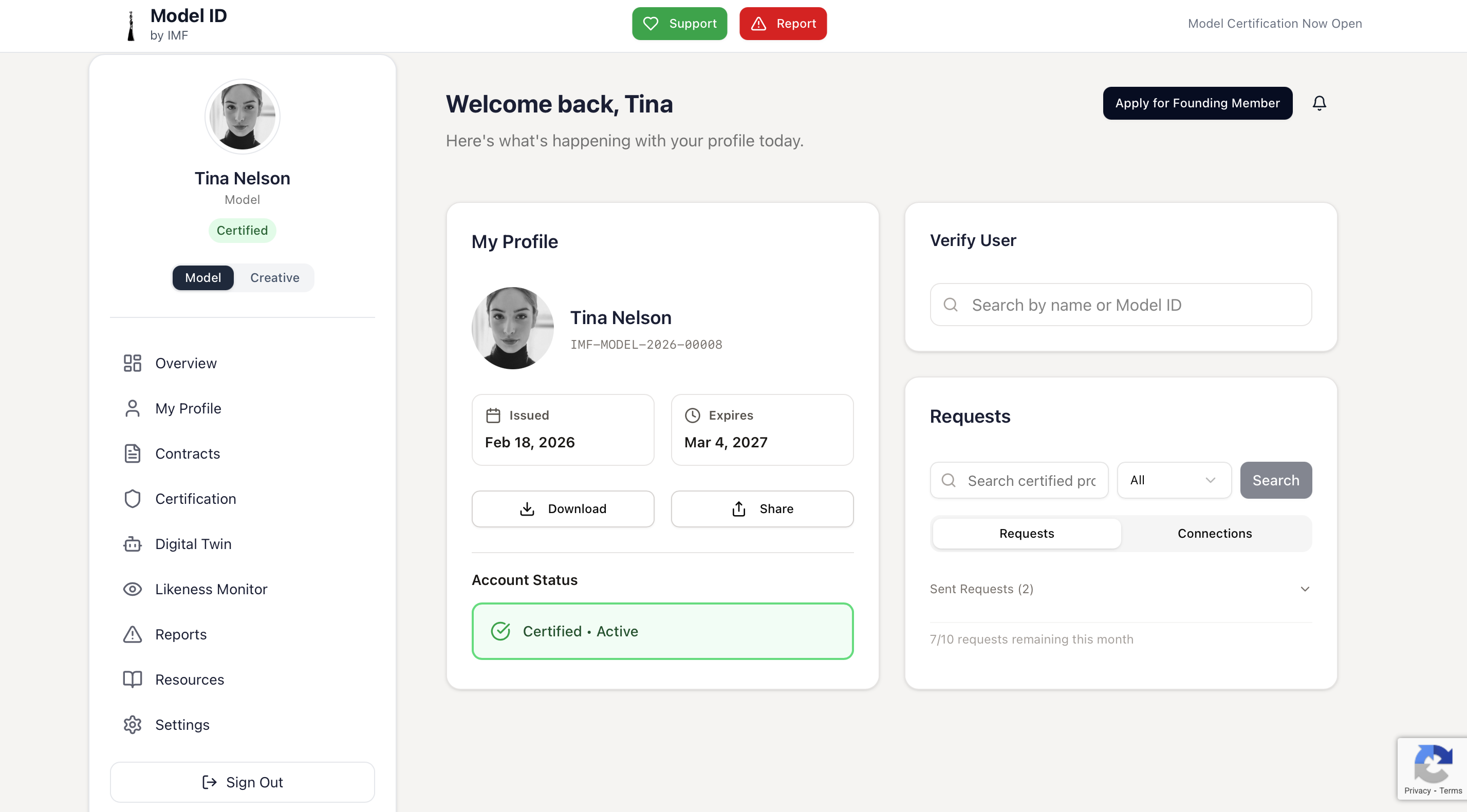 Models and creative professionals verify their identity through Stripe Identity, complete our certification process, and receive a digital certificate with a unique verification ID and public profile.